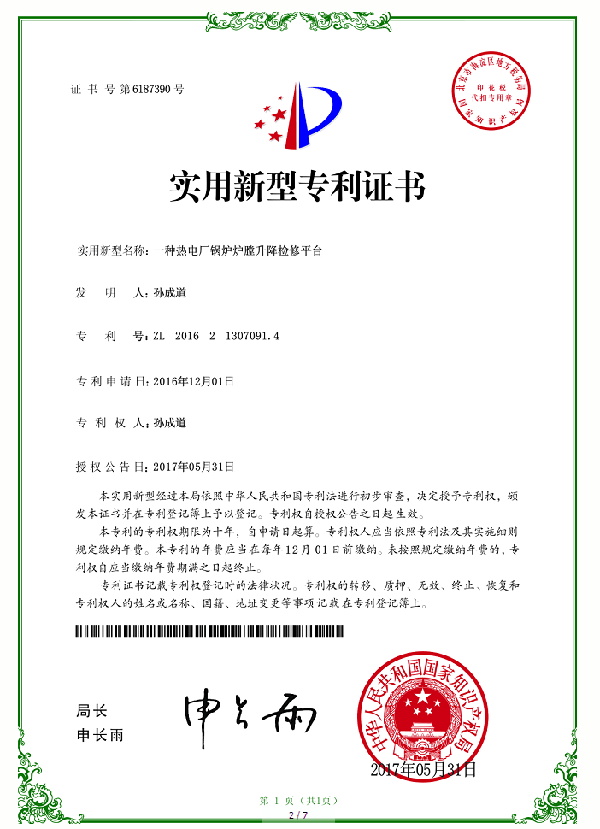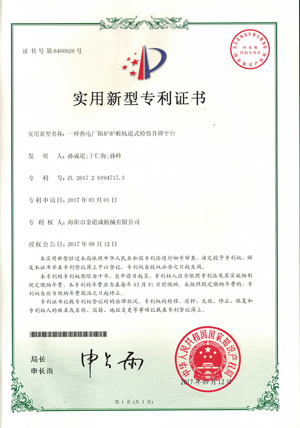 公司成立于2008年,年產“鍋爐爐膛檢修升降平臺”100余臺套的能力。自主研發的下支撐折疊式GJPT系列熱電廠鍋爐爐膛檢修升降平臺,于2016年獲得行業首項國家專利保護;經過數年的發展,為各種型號煤粉鍋爐和循環流化床鍋爐的爐膛檢修,提供出一系列門類齊全的檢修平臺設計方案,先后為國家能源集團、華潤電力、大唐集團、晉煤集團、益海嘉里集團公司、嘉吉糧油公司、中糧集團公司、山東時風集團、阜豐生物科技、晉煤集團等400余家公司設計、定制了鍋爐爐膛檢修升降平臺。